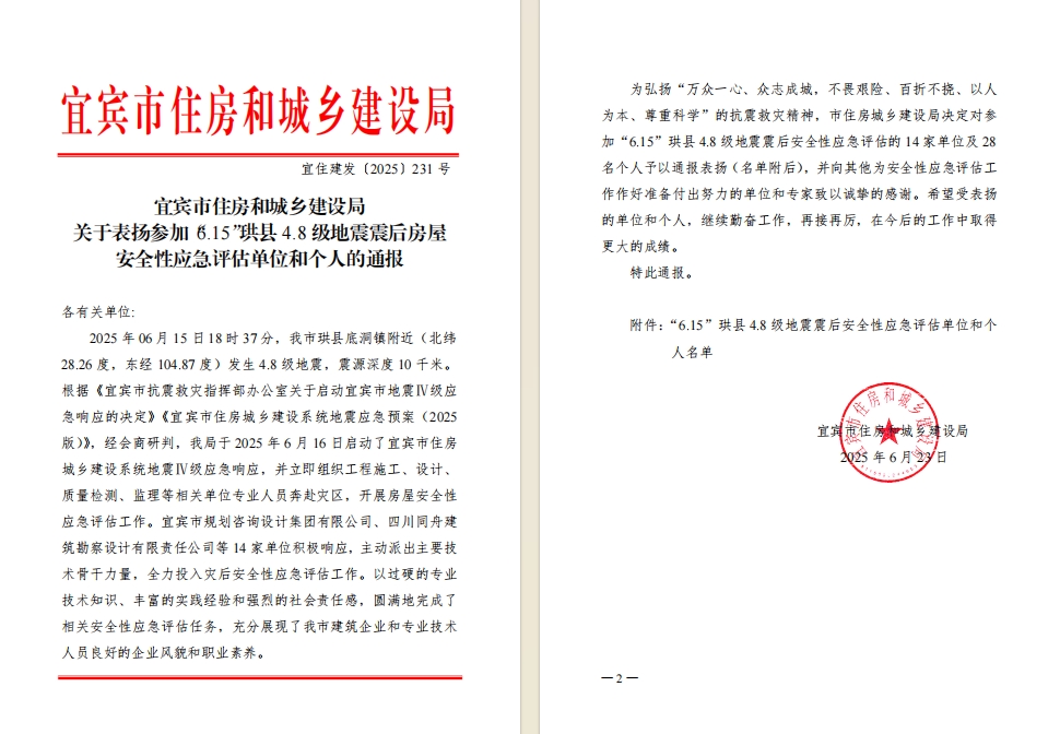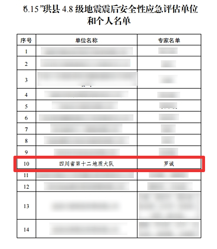 近日,为弘扬抗震救灾精神,宜宾市住房和城乡建设局对“6·15”珙县4·8级地震震后房屋安全性应急评估单位和个人进行通报表扬,共有14家单位及28名个人上榜,四川省第十二地质大队、队专业技术人员罗诚位列其中。此次通报既是地方政府对十二大队在抗震救灾中工作的肯定,更彰显了地质工作在保障人民生命财产安全中不可或缺的重要性。