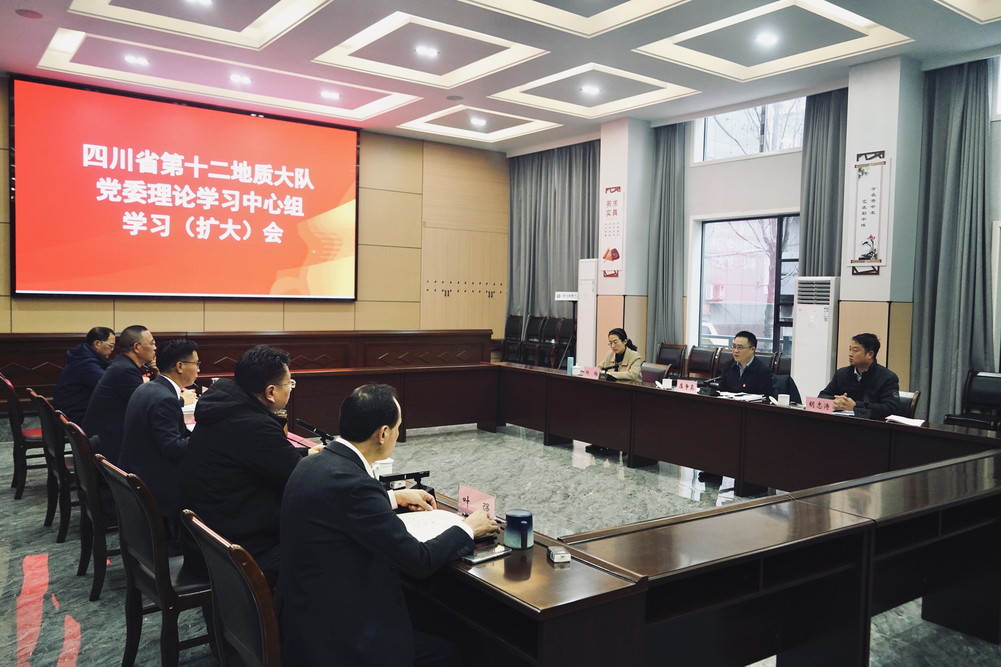 省地质局安全处副处长(主持工作)胡志涛、人事处副处长杨榕;十二大队党委理论学习中心组成员及相关人员参加会议。