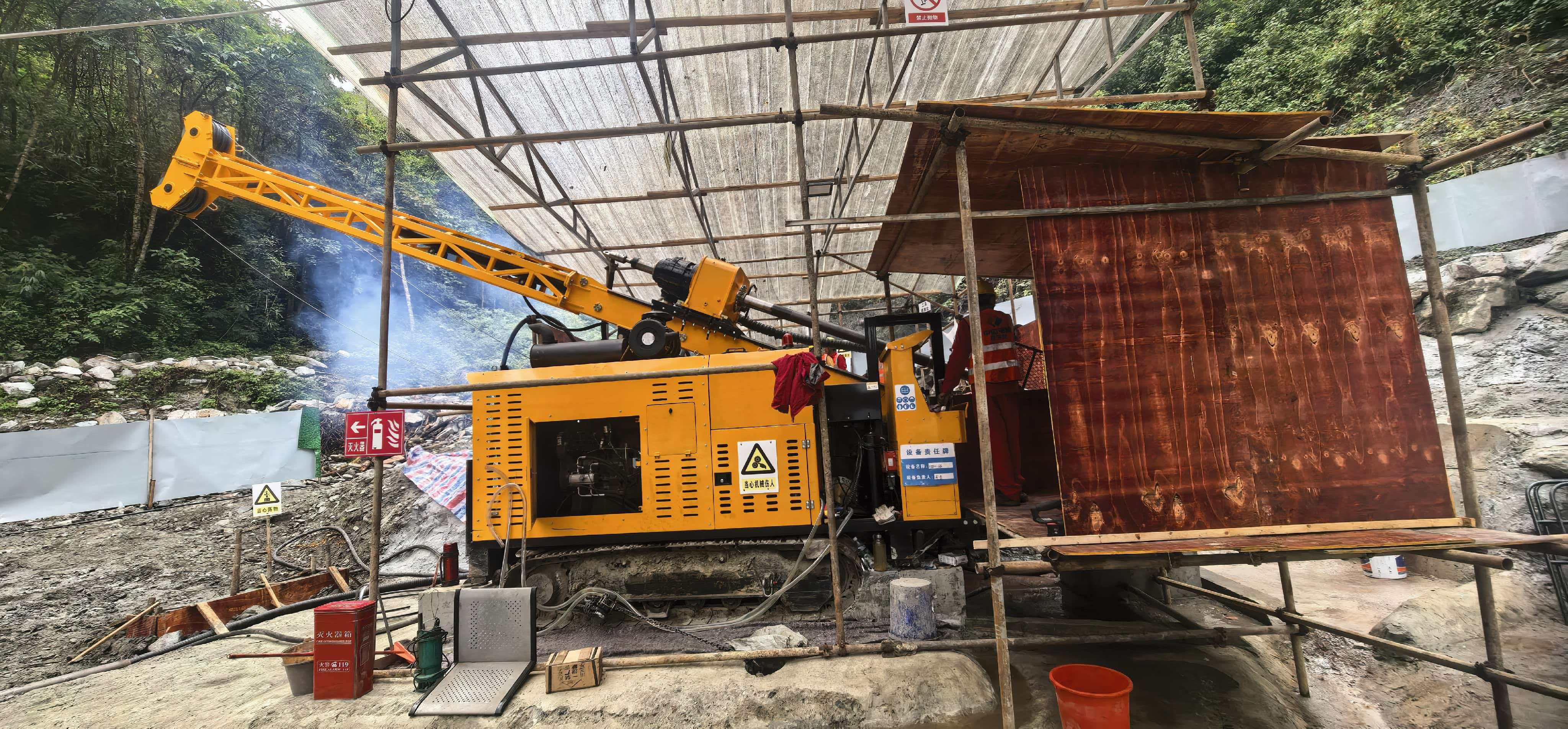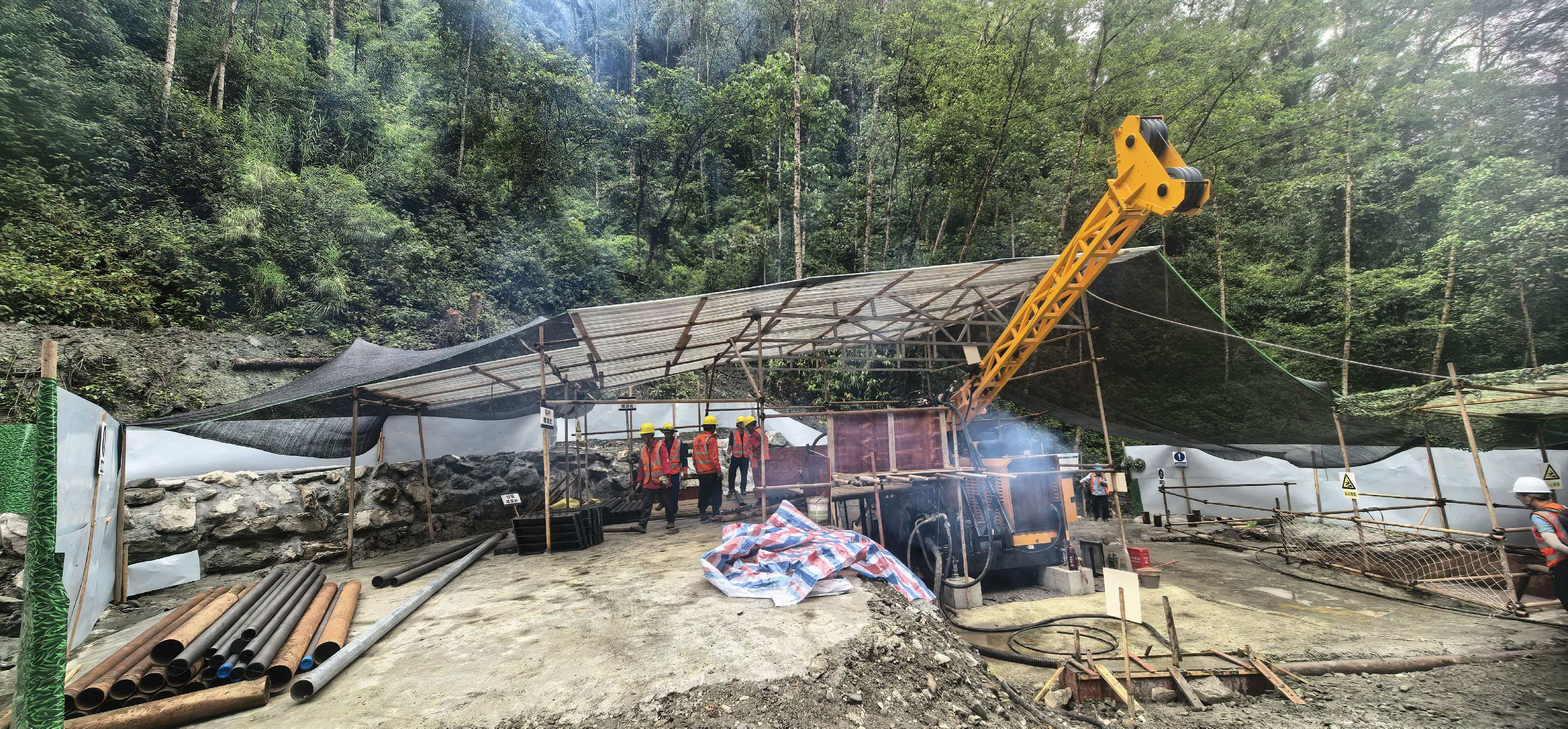 据悉,该项目位于西藏雅鲁藏布江悬崖边,海拔近3000米,钻孔所处地段植被茂密,临时施工便道需依山修建,长度超10公里,蜿蜒盘曲间高差超500米。同时,该设计孔深超千米,较为倾斜,施工难度极大,岩芯采取标准严苛。复杂的环境和严苛的标准对钻探技术、设备性能及现场管控提出了全方位挑战。